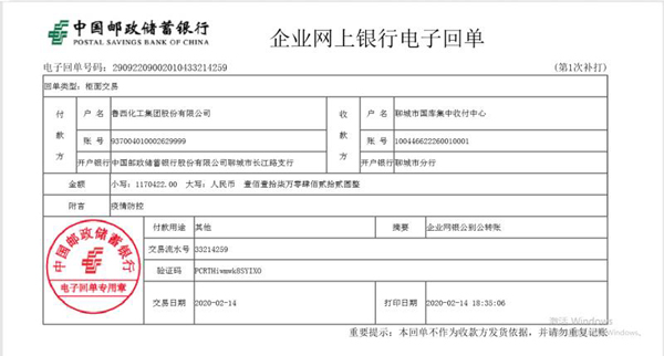 疫情就是命令,防控就是責(zé)任。捐款倡議發(fā)布后大家積極參與,踴躍捐款,許多干部員工主動多捐,奉獻(xiàn)愛心,以實(shí)際行動支持疫情阻擊戰(zhàn),短短一天時間,集團(tuán)干部職工共計捐款117萬元,并于2月14日18:30分匯入市國資委指定銀行賬號,支援一線的疫情防控工作。匯聚的顆顆愛心將涌動著奉獻(xiàn)的暖流,溫暖著人們齊心協(xié)力、共克時艱。