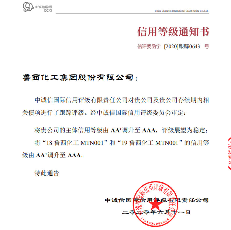 6月11日,中誠信國際信用評級有限公司出具最新評級報告,將魯西化工集團股份有限公司的主體信用等級由 AA + 調(diào)升至 AAA,評級展望為穩(wěn)定。