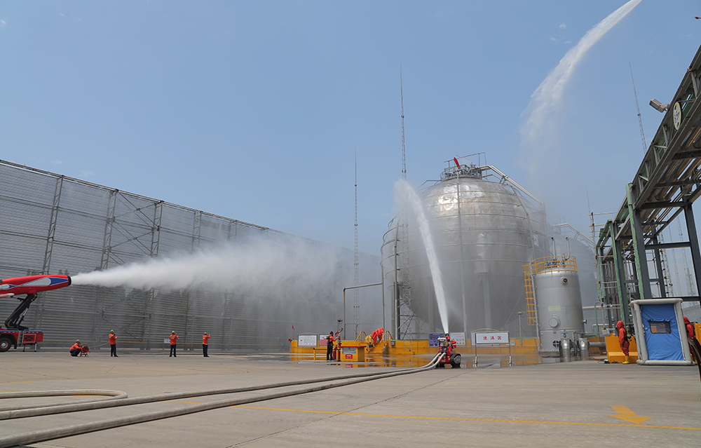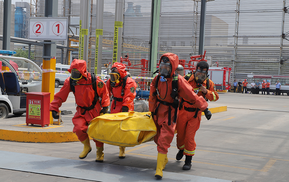 本次演練設(shè)定煤化一事業(yè)部液氨球罐區(qū)發(fā)生泄漏。演練過程采取實(shí)兵、實(shí)裝、實(shí)景、實(shí)訓(xùn),突出上下聯(lián)動(dòng)、部門協(xié)同,模擬危化品企業(yè)氨氣泄漏事故發(fā)生后,企業(yè)開展先期自救,市、區(qū)等各級(jí)政府根據(jù)應(yīng)急預(yù)案組織各相關(guān)單位和應(yīng)急救援隊(duì)伍開展搶險(xiǎn)救援。同時(shí),利用無人機(jī)實(shí)施全方位、多角度實(shí)地偵查,有序開展處置工作,周密部署應(yīng)急搶險(xiǎn)救援工作,成功處置了泄漏險(xiǎn)情,演練取得圓滿成功。