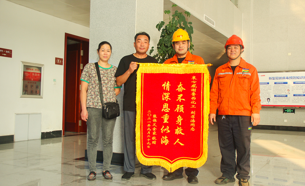 “非常感謝伸出援助之手,如果不是您及時救助,后果不堪設(shè)想,真是太感謝了?!辈痪们埃某鞘忻駨埾壬?,將一面寫有“奮不顧身救人 情深恩重似?!钡腻\旗送到魯西集團第一工程事業(yè)部劉召浩手中,以此來表達(dá)他深深地感激之情。
