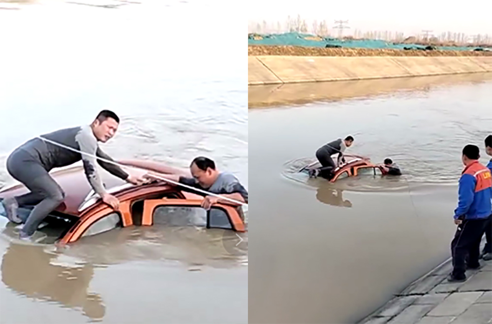 3月28日早6:30,325國(guó)道上車(chē)流如織,正是魯西集團(tuán)員工上班比較集中的時(shí)間段。此時(shí),在一干渠河水中,有一輛近乎被水沒(méi)頂?shù)霓I車(chē)自上游緩緩漂下。魯西集團(tuán)第二工程事業(yè)部員工劉繼赟、孫慶旺行駛到325國(guó)道一干渠橋時(shí),發(fā)現(xiàn)了這輛在河水中漂浮的轎車(chē)。二人隨即停下車(chē),近前查看。但由于河水已近淹沒(méi)車(chē)頂,無(wú)法看到車(chē)內(nèi)是否有人員存在。二人立即決定下水營(yíng)救。