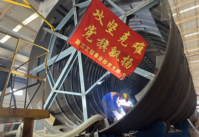 目前,魯西集團40萬噸/年有機硅項目的建設(shè)施工正在緊張有序進行中,二元塔作為項目的核心設(shè)備進入了制作的關(guān)鍵期,該設(shè)備共有三臺,單臺高度90m,直徑6.6m,重量達1000噸,且設(shè)備內(nèi)部結(jié)構(gòu)復(fù)雜,焊接工作量大。由于設(shè)備體積大,無法在廠房內(nèi)完成整體制作,為保證設(shè)備制作質(zhì)量,充分考慮后期運輸安裝等因素,技術(shù)部門反復(fù)研討論證,首次采用了“車間預(yù)制+現(xiàn)場組焊”的方式進行大型高塔設(shè)備制作。基層黨支部抽調(diào)精干力量,成立黨員突擊隊,一部分在車間加班加點對二元塔預(yù)制,另一部分到項目現(xiàn)場進行設(shè)備底部裙座環(huán)縫合口焊接、外口焊接等工作。廣大黨員克服戰(zhàn)高溫斗酷暑,認(rèn)真落實各項安全措施和質(zhì)量管控要求,為設(shè)備制作保質(zhì)保量按期完成奠定了基礎(chǔ)。