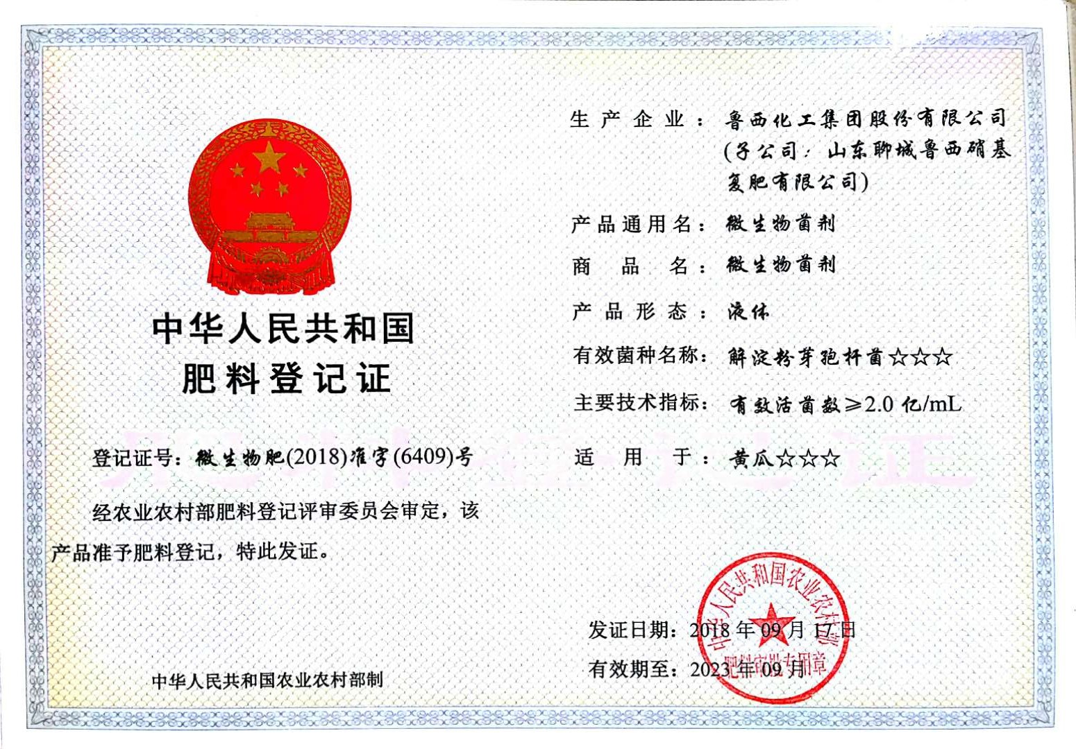 10月7日,收到了農(nóng)業(yè)農(nóng)村部肥料評審登記管理處寄來的魯西集團農(nóng)業(yè)用微生物菌劑肥料登記證書,共涉及兩個菌種:解淀粉芽孢桿菌、多粘類芽孢桿菌。登記證號分別為“微生物肥(2018)準字(6409)號”、“微生物肥(2018)準字(6410)號”。登記證有效期至2023年9月。